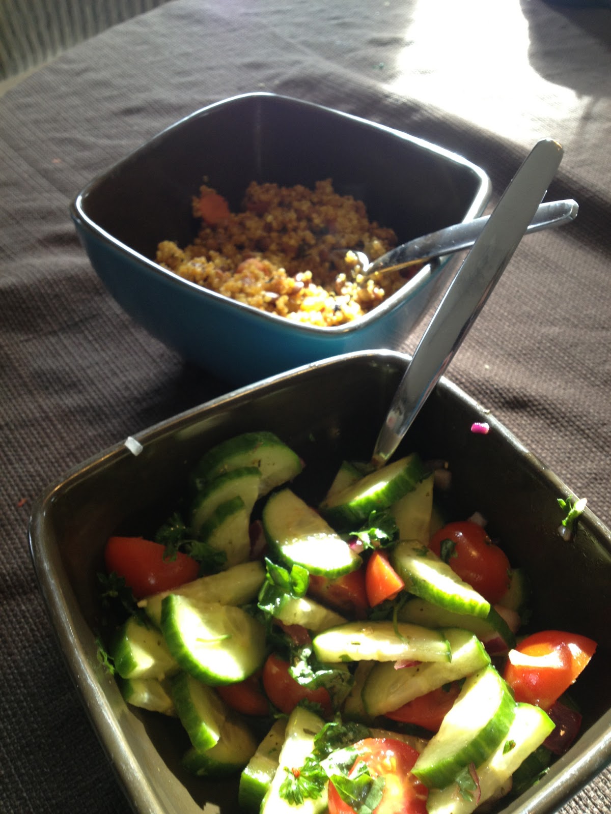 So for lunch it’s quinoa pilaf and 1/2 serving of the cucumber and tomato salad. Both of these meals I really like. You can make both in bulk and then take for lunch every day of the week. So if you are looking for variety in your meals and lunches this is a great way to do it!