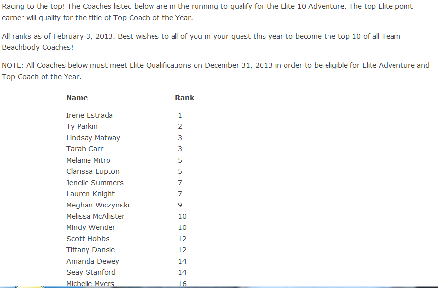 When I woke up and got myself together I sat down to the computer to do my daily check ins with my team and my challenge groups. I was taken back by a video that one of my super star coaches Marlena Hedine created. I guess I should probably back up and give you some history! Yesterday the leader boards for Beachbody Coaches in January came out. I got a call from a good friend of mine Seay screaming in my ear telling me that I was ranked #5 in all of Beachbody! That means that out of 100,000 coaches in the network my organization is 5th!!! I seriously fell off my chair. I had to go and look for myself because I didn’t believe her! I knew that my team had an amazing January but I had no idea that we HAD THAT AMAZING OF A MONTH! I mean we blew the socks off of the leaders in the organization! In one year I went from an Emerald Beachbody Coach to a 2 Star Diamond Elite Coach which means my income quadrupled, I now get monthly car allowance and quarterly bonus for my hard work. It was really cool to see the poster come out this year of all the Elite Coaches and BE ON THERE!!