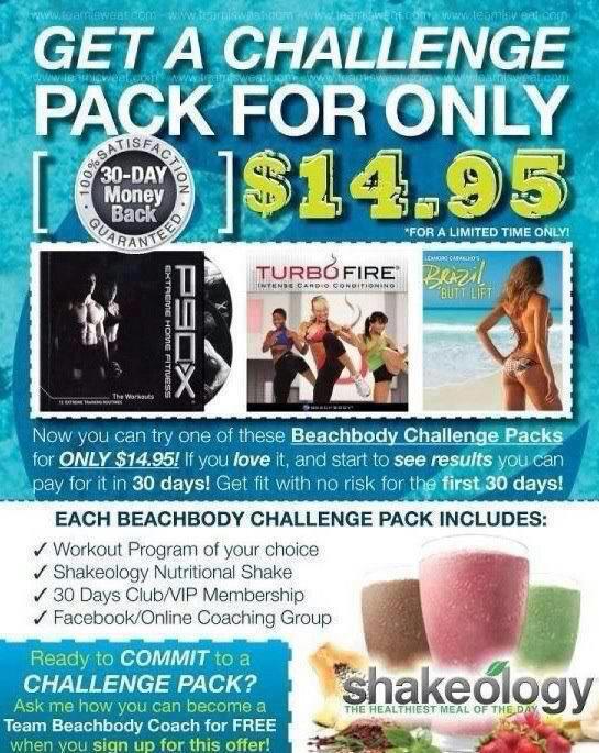 So I have a lot of readers that are just not so sure what this whole Beachbody thing is that I do! I’m really excited to announce a special offer that will end on the 31st of July! You can actually try P90X, TurboFire or Brazil Butt Lift and Shakeology for 30 days for just the price of the shipping, $14.95. Then at day 30 you are charged for the challenge pack itself. This way you can truly see if doing a home workout program like P90X would fit into your lifestyle.