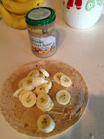 - 1 whole grain tortilla with 1 tbsp all natural peanut butter and 1 banana sliced, create a roll up.