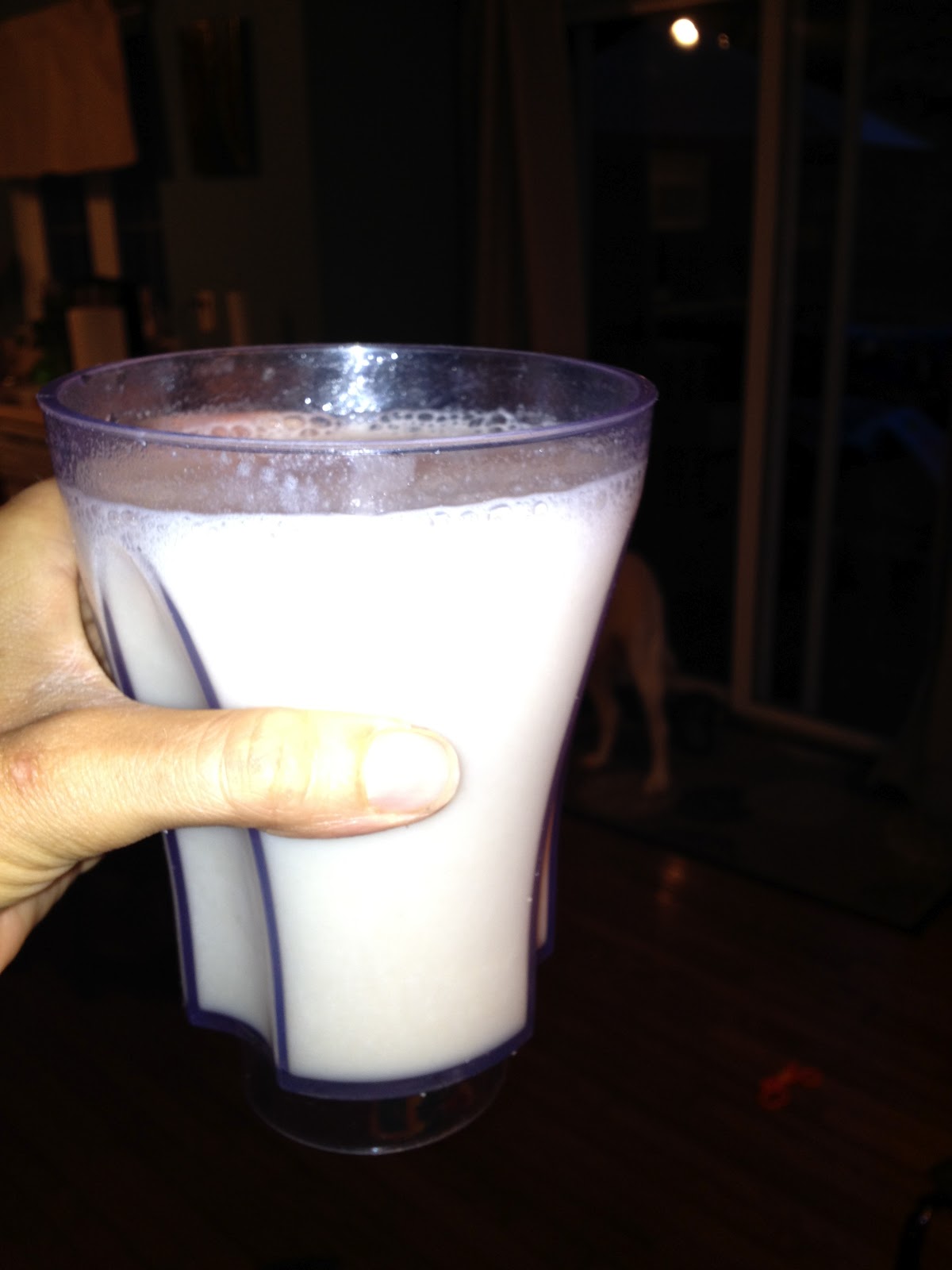 - Protein Shake- 1 scoop vanilla protein powder, 12-14 oz water, frozen fruit.