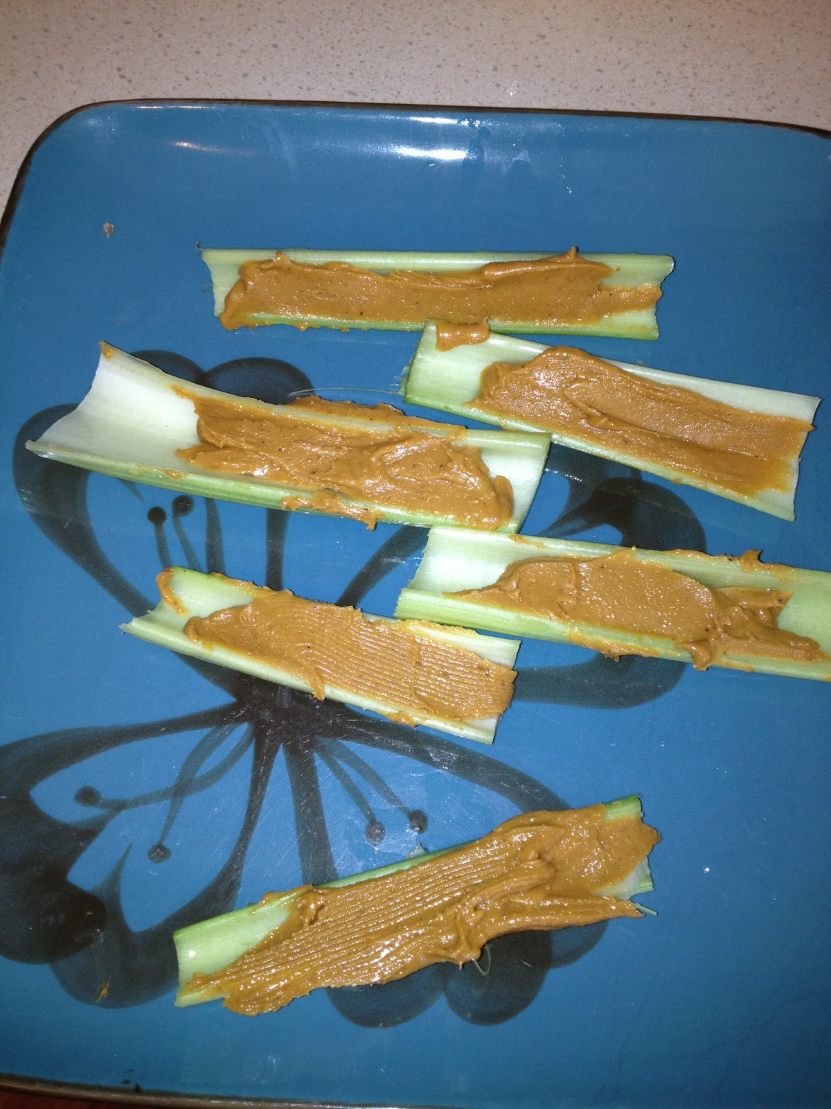 - 2 cups of celery and 1-2 tbsp all natural peanut butter (the only ingredient should be peanuts)