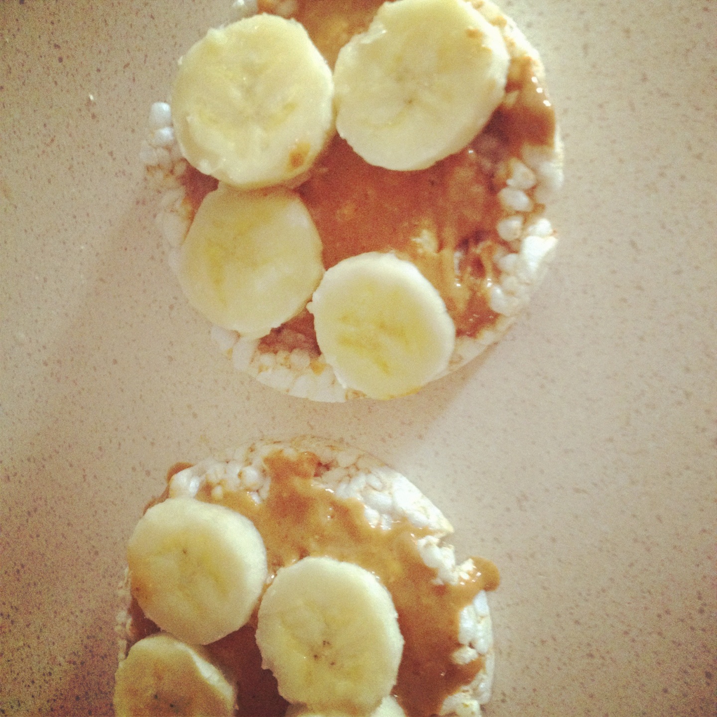 - 2 plain unsalted brown rice cakes with 1-2 tbsp all natural peanut butter.